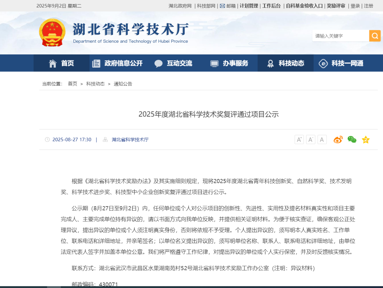 8月27日,湖北省科学技术厅发布《2025年度湖北省科学技术奖复评通过项目公示》,武汉半边天凭借过硬的技术实力与突出的行业贡献,一举斩获两项省级科技大奖!